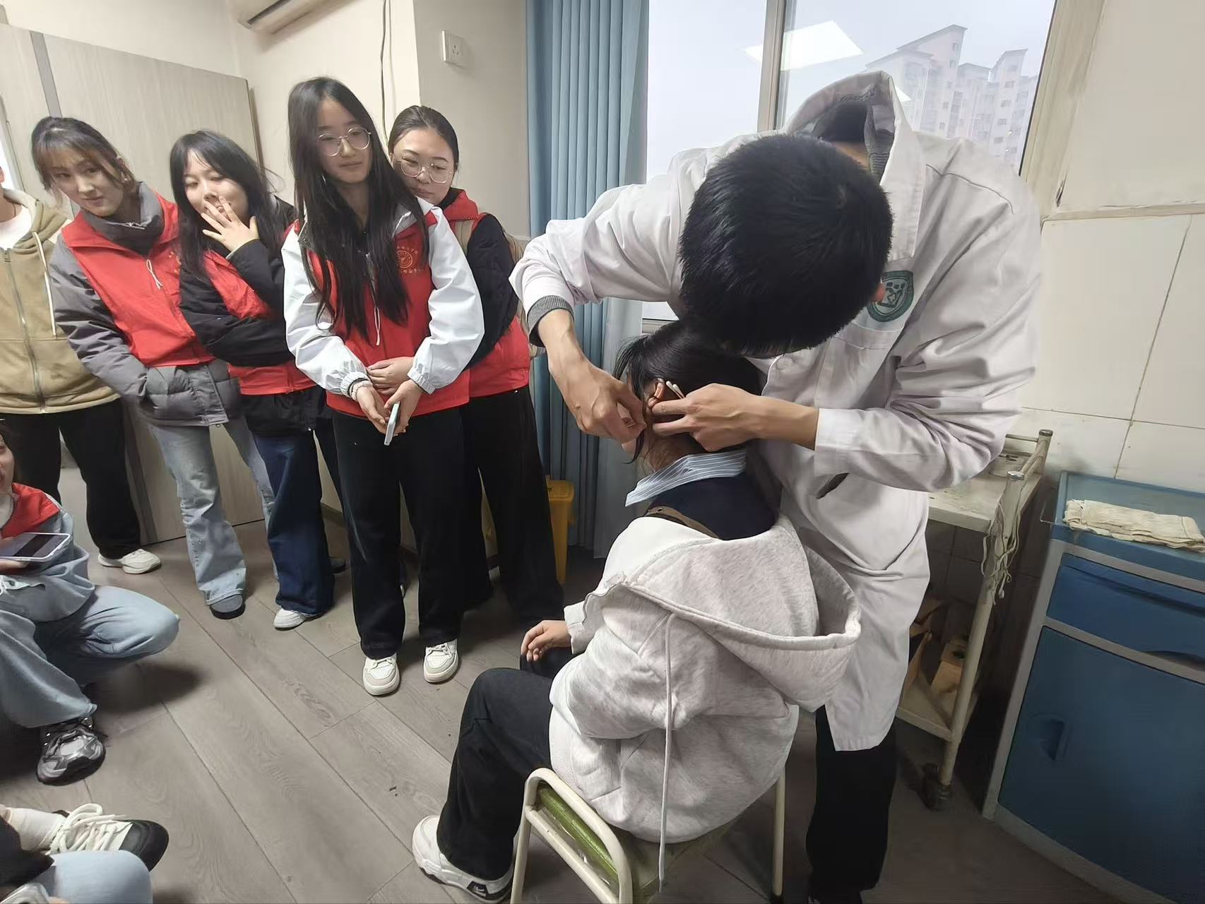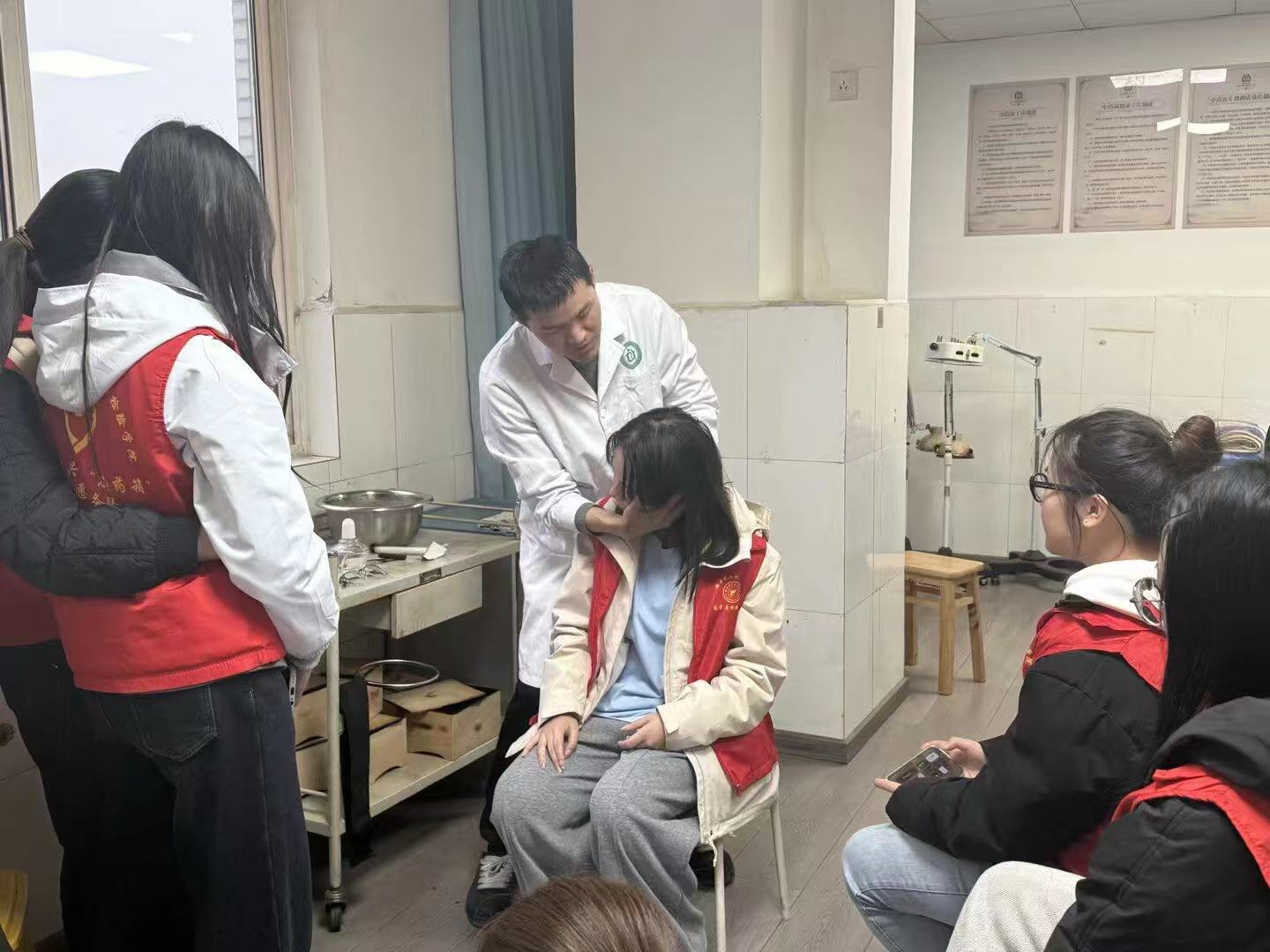在医师的专业指导和严格的安全保障下,志愿者们分组有序地体验了艾灸、针灸和推拿按摩项目。体验艾灸时,温热之感在穴位上缓缓渗透,大家切身感受到艾草温通经络、驱散寒邪的作用。针灸体验环节,医师精准取穴,当银针刺入皮肤的瞬间,志愿者们感受到酸、麻、胀、重的“得气”之感,对经络循行的客观存在有了神奇而真切的体会。推拿按摩则通过专业的手法,有效缓解了部分志愿者身体的疲劳与酸痛,让大家体验到了中医外治法立竿见影的放松效果。