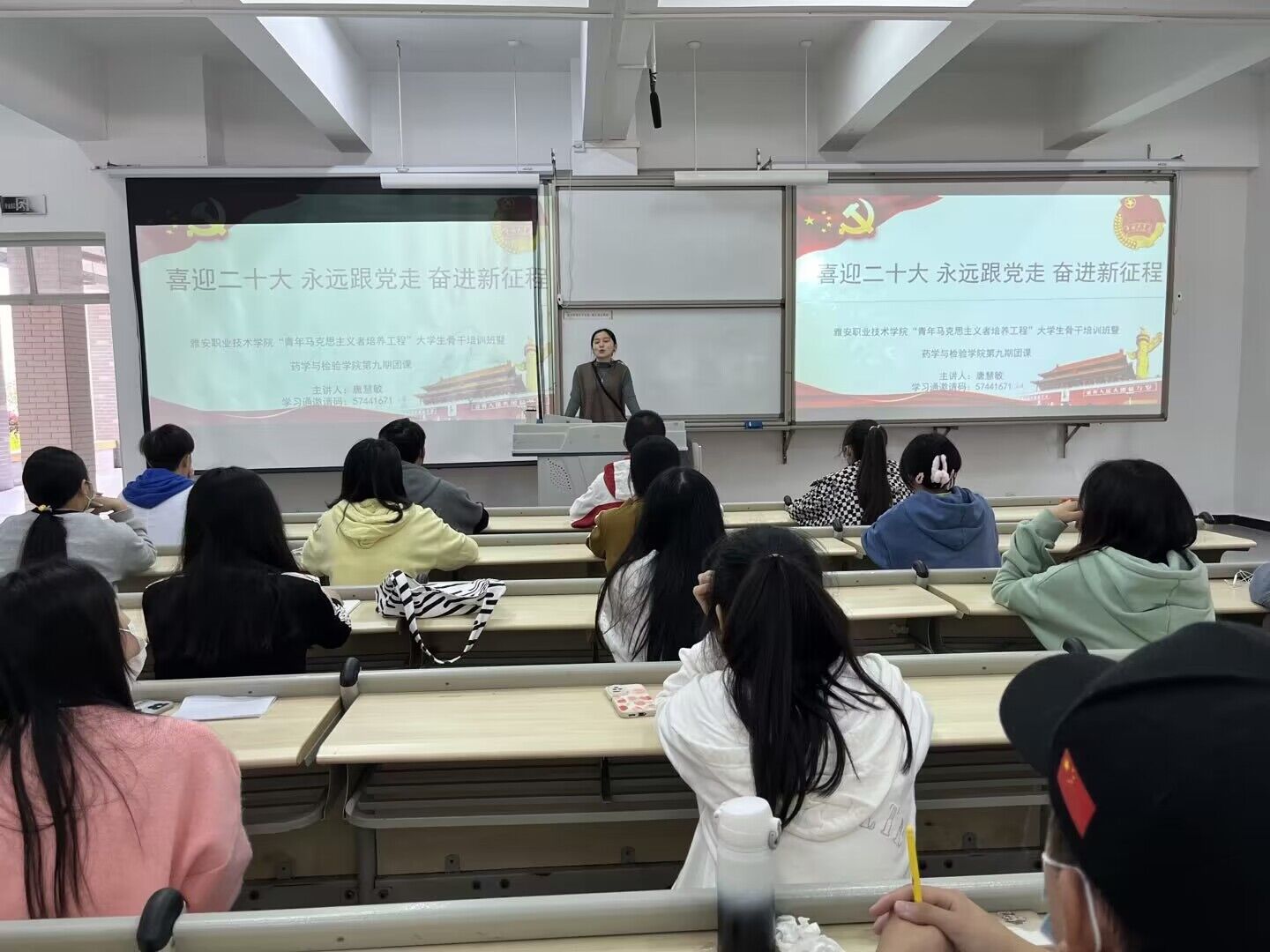 唐慧敏老师带领同学们学习基础团务知识,在铿锵有力的团歌合唱中,融入了同学们对祖国深深的热爱与自豪之情;王伟才书记带领同学们学习党的二十大会议精神,从“党的二十大大会主题”到“三十二字建党精神”,并结合“二十大报告”总结出当代青年应该不忘初心,牢记使命,对党忠诚,不负韶华;芦珂老师带领同学们学习党的十九届六中全会精神,并重点讲解了中国共产党百年奋斗的重要成就和历史经验,阐述了党伟大百年奋斗征程的历史意义;鲜敏老师带领同学们学习习总书记在庆祝中国共产主义青年团成立100周年大会上的讲话精神和习总书记关于青年工作中的重要思想。