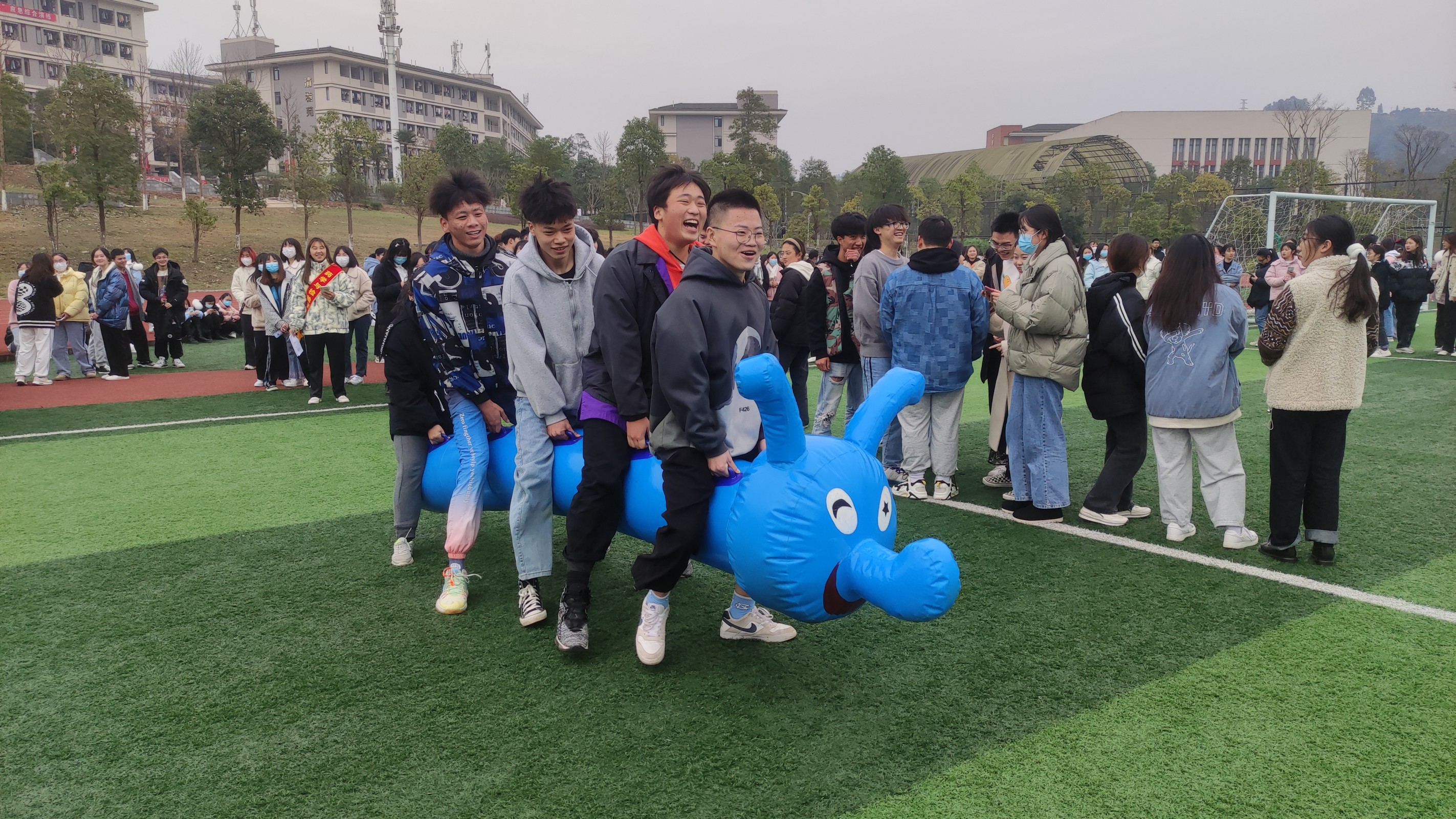 本次运动会共设有“齐心协力过草地”、“翻越夹金山”、“强渡大渡河”、“四渡赤水”、“巧夺金沙江”以及“胜利会师”共计六个具有红色长征韵味的活动,共计37支队伍参赛。随着主持人宣布运动项目的比赛规则和裁判员的一声哨响,趣味运动会正式开始!赛场上,参赛队员们个个精神抖擞,“跳、跑、闪、搂、抱、伸、弹......”十八般武艺尽显,运动员们抱着“争取第一,重在参与”的精神,默契配合,享受着每一项趣味比赛带来的身心放松和愉悦。观战的同学们也热情似火,加油声、呐喊声、欢笑声此起彼伏。经过一下午激烈角逐,比赛项目一、二、三等奖最终各自花落有主。赛后,同学们有序离开并留下了欢声一片,自此趣味运动会落下了圆满的帷幕。