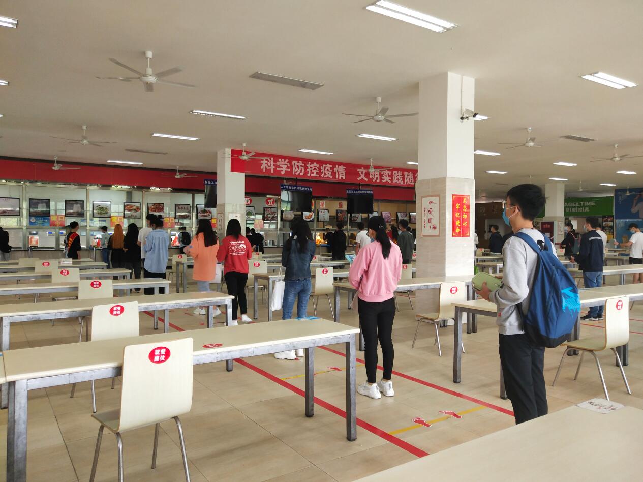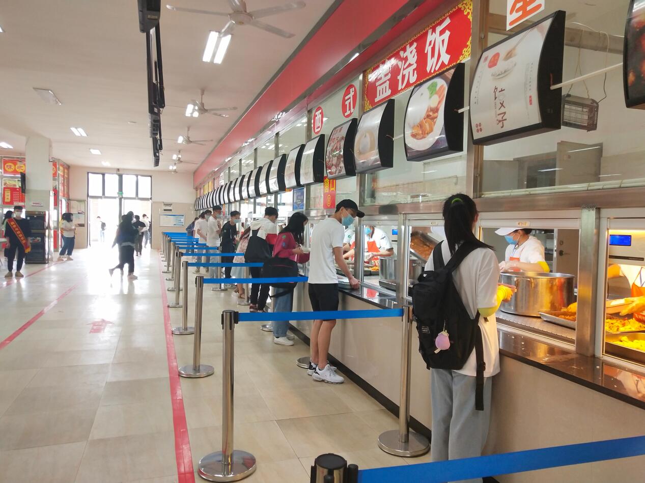 为确保同学们在校期间的有序就餐,员工分专业、分批次错峰就餐,在食堂采取“前门进,侧门出,堂食一桌一人,排队间隔1.5米,自带餐具,测体温,戴口罩”等措施,对疫情期间食堂就餐做出明确规定。20名志愿者们在值班老师的带领下,精神饱满地坚守在各自岗位中,细致地维持着就餐秩序,提醒和引导同学们文明就餐,根据食堂内的就餐入座率和排队情况,及时提醒场外志愿者组织食堂外同学排队,避免扎堆等不文明现象的发生。通过志愿者们的共同努力,为师生校园就餐筑起了一道坚实的安全防线。