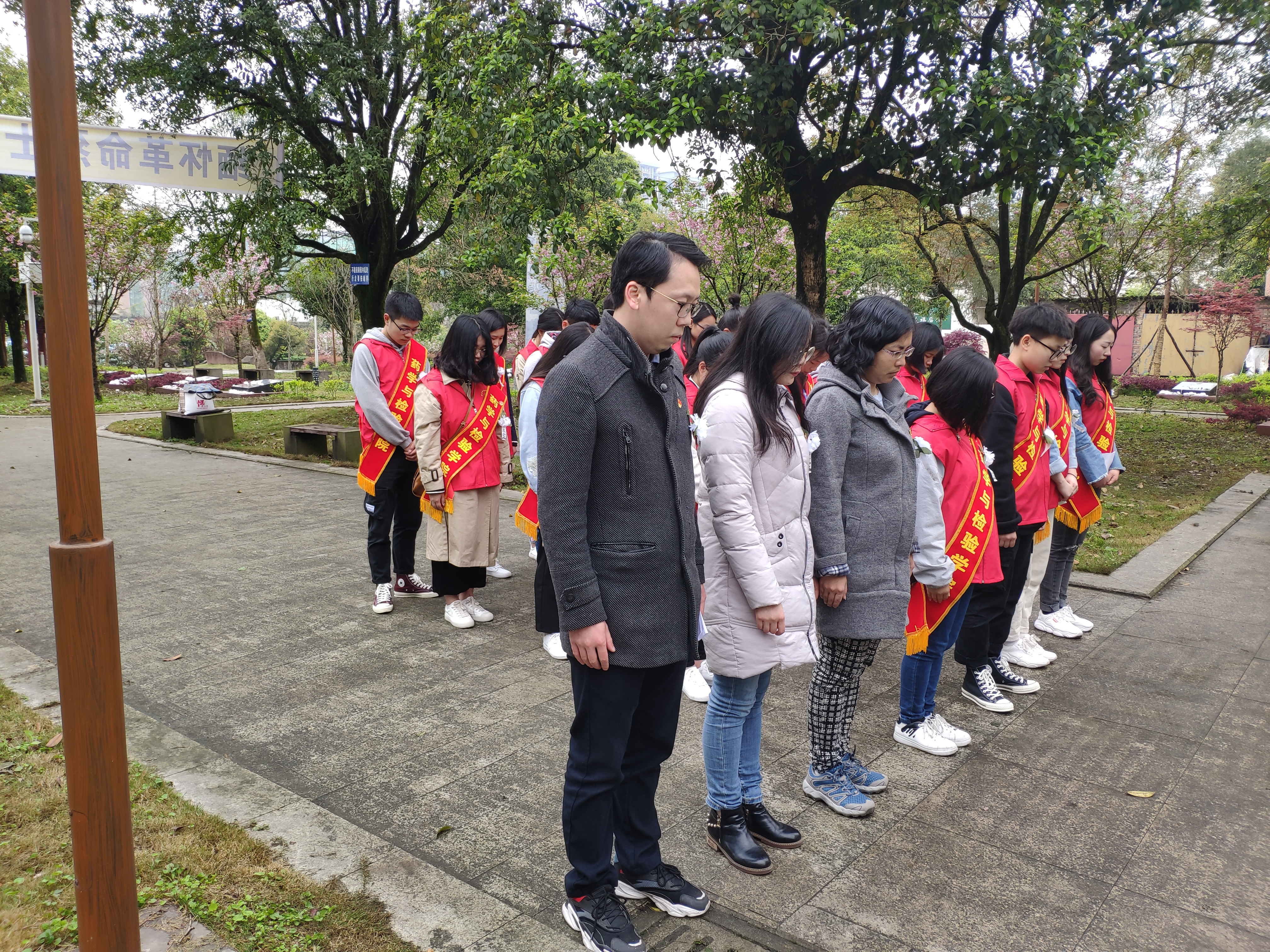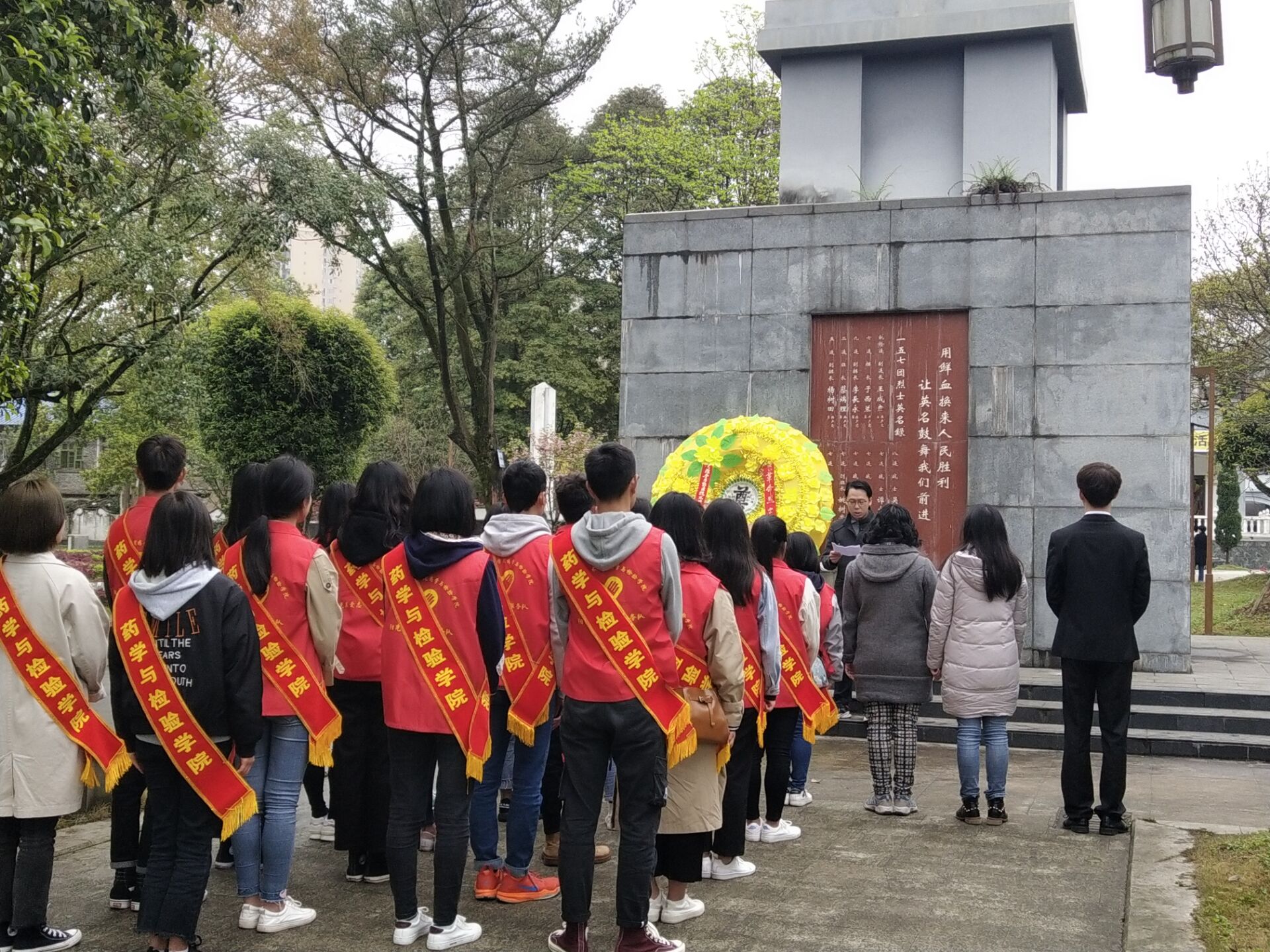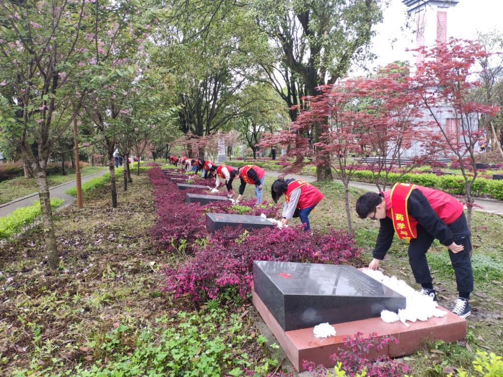 上午10:30,到达烈士陵园,同学们胸前佩戴团徽和小白花,在纪念碑前整齐列队,清明祭扫活动正式开始。主持人宣布活动正式开始后,员工代表方雨晴宣读悼念词,向革命烈士致敬。接着全体师生默哀三分钟,默哀结束后两名志愿者向烈士敬献了花圈。随后,员工代表唐思奕带领着大家宣誓——人民为先,祖国至上,诚实勇敢,自律自强,奋发有为,誓做栋梁......宣誓仪式后,由药学检验公司员工党支部书记杨文君老师发言,他说到“无数先烈用鲜血和生命换来民族的独立和人民的解放,同学们应该牢记历史,缅怀革命先烈,学习先辈的爱国主义精神和英雄气概”。员工代表刘锡铭也发言说:“我们是时代的幸运儿,新中国迎来了崭新的时代,我们懂得幸福生活的来之不易,更应该自立自强,从身边的小事做起,为实现中国梦而奋斗”。仪式结束后,老师同学们各自散开,大家怀着崇敬的心情,擦拭墓碑,向烈士献上小白花,向革命烈士致敬。