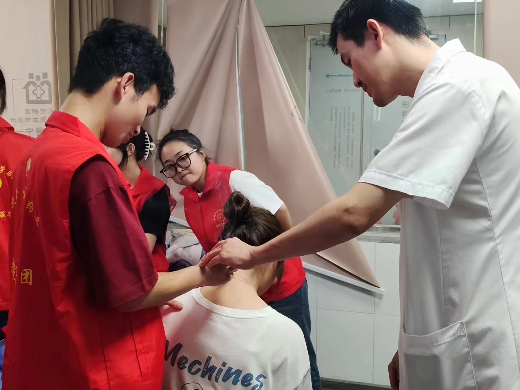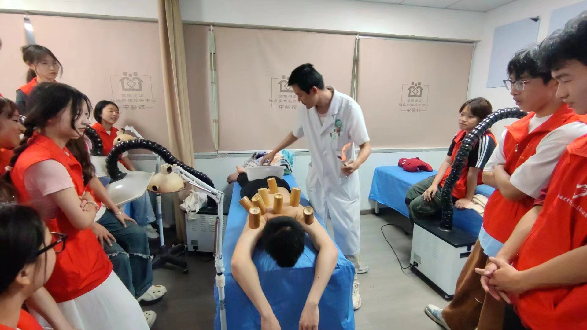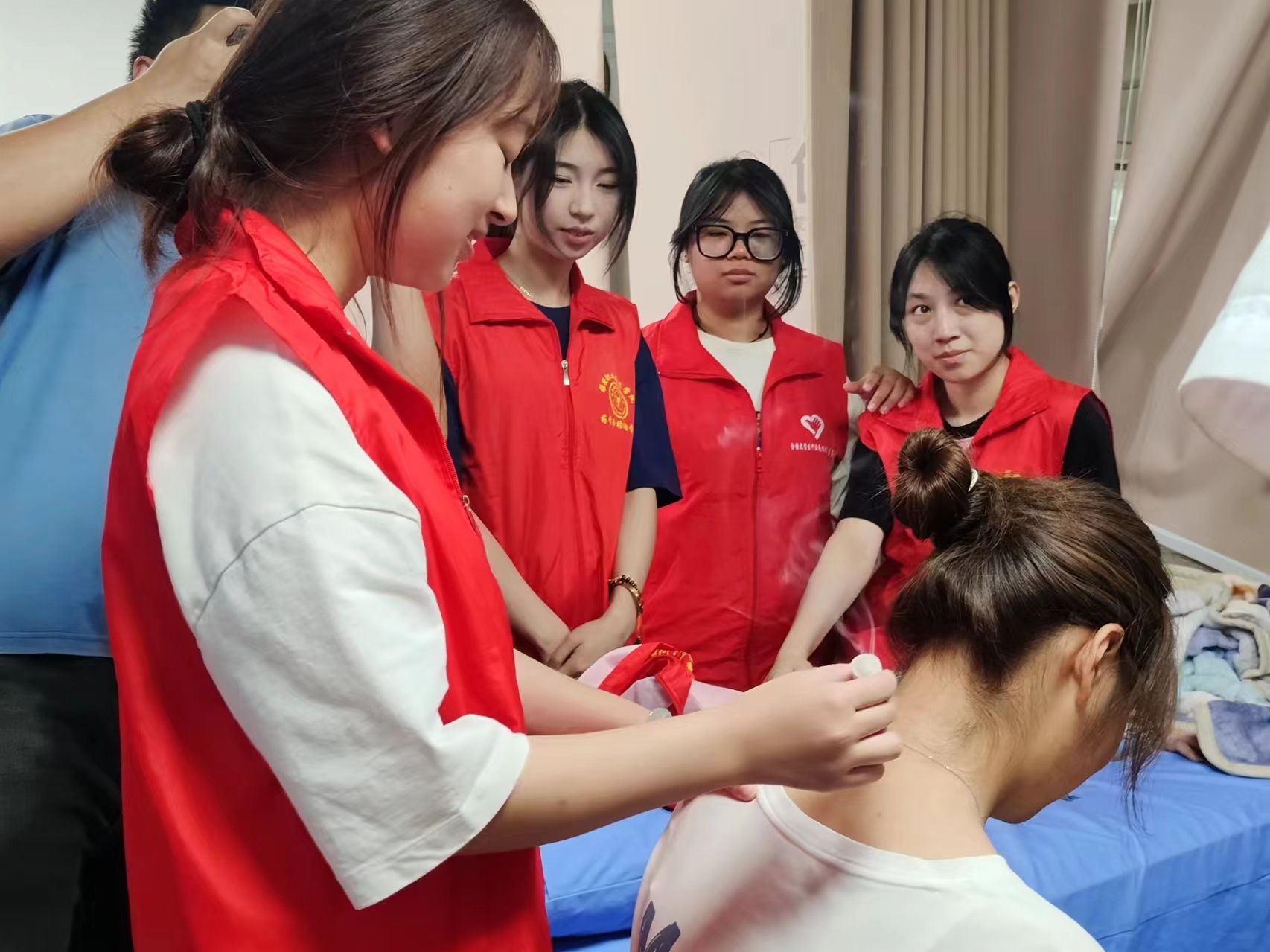 活动开始,医院老师首先为同学们详细讲解了拔火罐、艾灸的种类以及基本原理。通过讲解,同学们了解到拔火罐是一种传统中医外治法,具有通经活络、行气活血、消肿止痛等作用,艾灸有温经散寒、行气通络、升阳举陷等作用。在理论知识的基础上,老师为同学们演示了拔火罐、艾灸的操作流程。从选罐、点火、吸罐到起罐;点艾条、患部位灸,灭艾条等步骤,每一步都讲解得非常详细。同学们聚精会神地观看老师的讲解以及实操演练。演练结束后,老师鼓励同学们自己上手体验,同学们纷纷拿起火罐和艾条互相体验拔火罐和艾灸的感觉。在体验过程中,同学们感受到了拔火罐和艾灸带来的舒适感和放松效果,对中医文化产生了更加浓厚的兴趣。