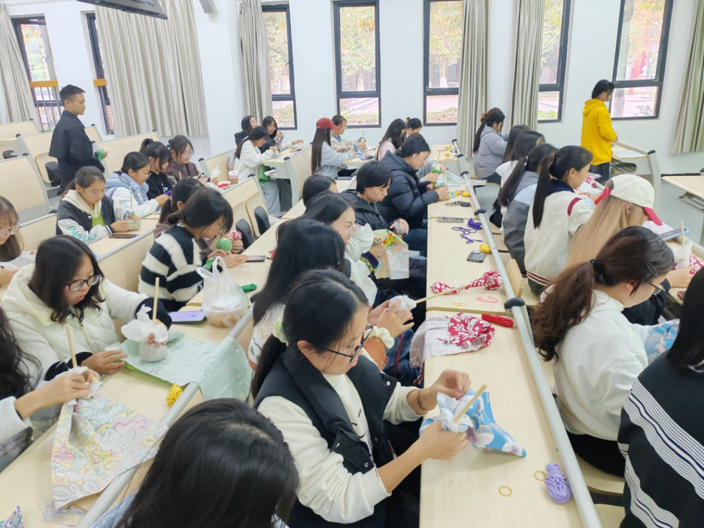 活动开始前,由主持人普及非遗知识并讲解香锤的历史文化以及制作要领。主持人讲解完后,现场工作人员有秩序地为参与人员分发香锤材料以及药材。在工作人员的现场指导下,同学们按照制作步骤陆续完成香锤的制作。活动过程中大家互相帮助,共同营造了一种其乐融融的活动氛围;同学们的积极参与让活动现场充满了欢声笑语让这个小小的教室充满了非遗韵味与青春活力独特的气息。