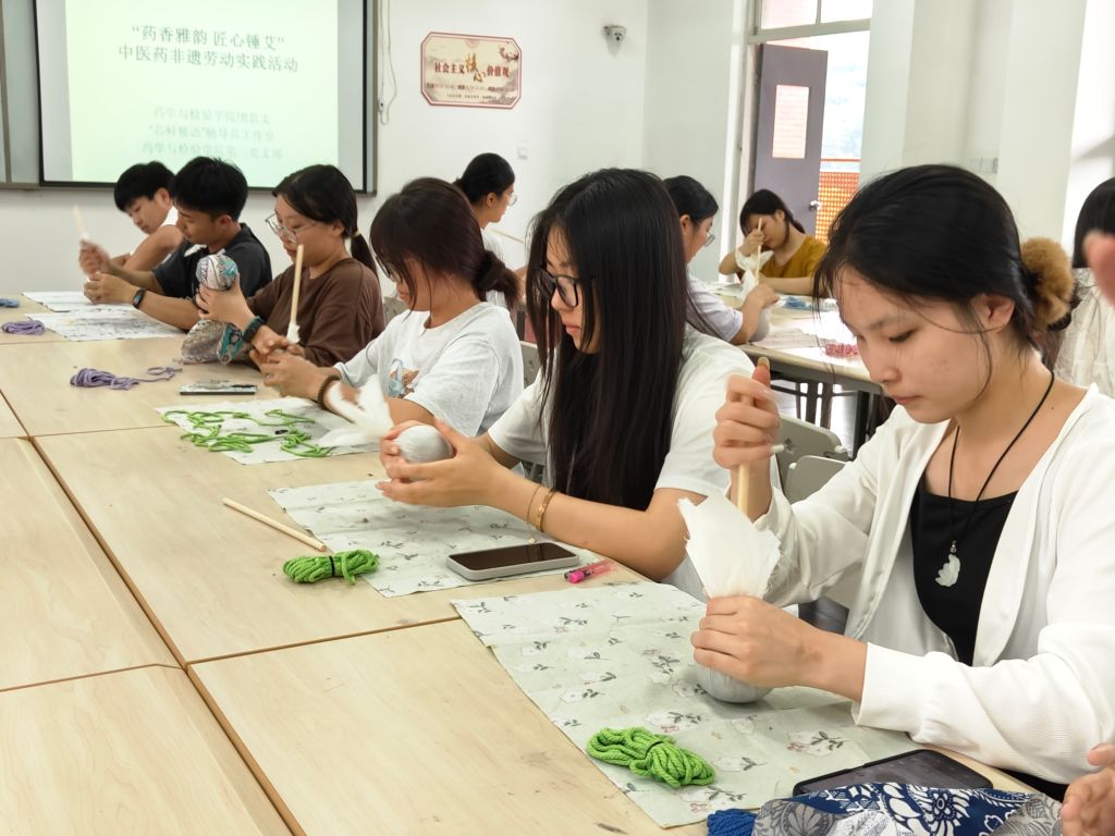 活动现场艾香浓郁,最大的亮点在于同学们全程“以手代槌”的深度参与。在曾晓梅老师以及鲜敏老师的指导以及两位员工骨干的带领下,大家直接用手掌替代传统工具,对精选的艾叶进行反复揉搓、拍打和锤制。每一次捶打、揉碾都需掌握力度与节奏,现场虽无槌声,却充满了专注的劳作气息与艾草特有的清冽芬芳。经过辛勤的手工捶打,艾叶最终化作细腻柔软的初绒。紧接着,同学们亲手捧起这些带着体温的成果,细心填充、封口,制作出兼具实用功效(驱蚊、安神)的艾锤。